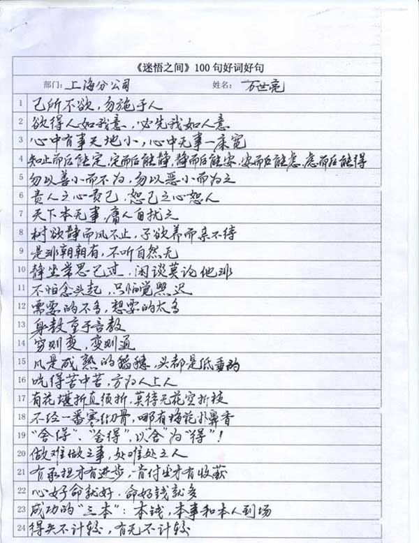 這項比賽成了大家工作間歇、飯余茶后的熱談話題。你一句“己所不欲,勿施于人”,我一句“吃得苦中苦,方為人上人”。包括基層的清潔阿姨,每個人都被一種濃濃的學(xué)習(xí)氛圍感染著,更有同事將這100句全部背了下來,活靈活用。比賽者一次抄寫不好就一次又一次的重新抄寫,直到自己滿意為止。