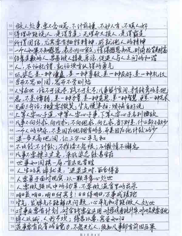如何做人?我們學(xué)到了“得理而能饒人,是謂厚道;無理而又損人,是謂霸道�!�;如何做事?我們學(xué)到了“做事無怨無悔是上等人,有怨無悔是中等人,有怨有悔是下等人�!�;如何成功?我們學(xué)到了成功有三本:“本錢,本事和本人到場”。
