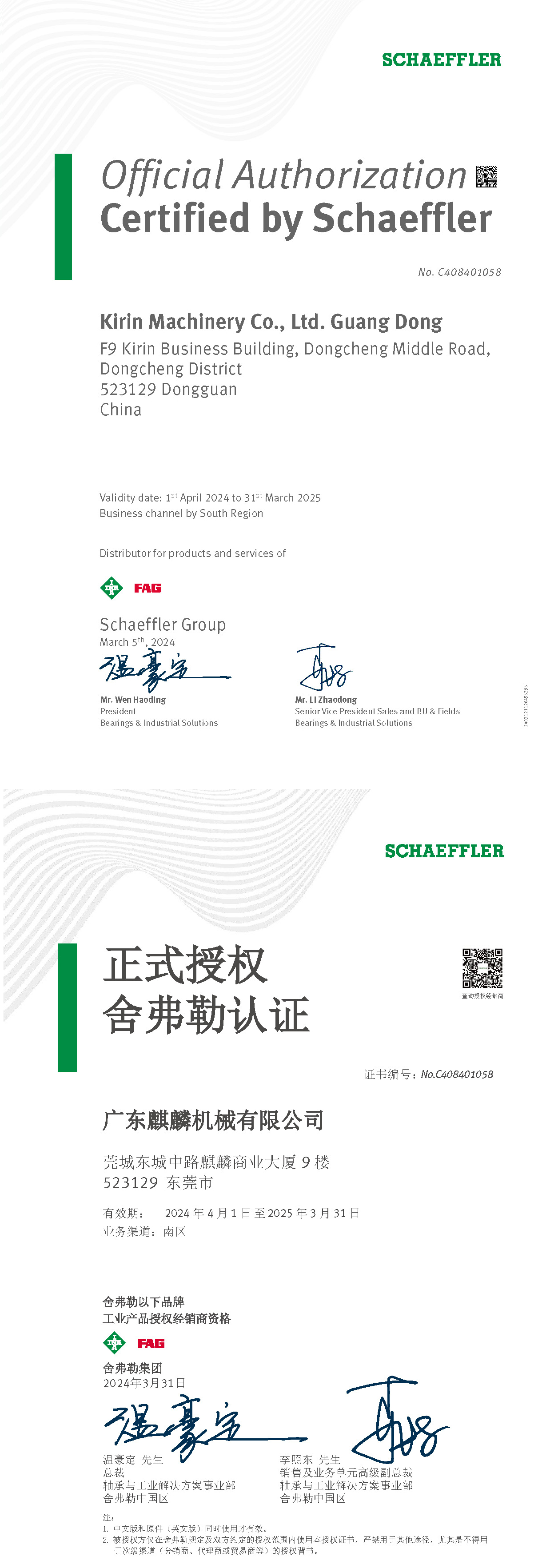 德國舍弗勒集團(INA/FAG/LUK)授權(quán)證書