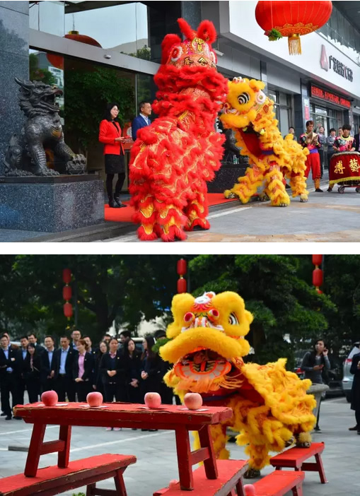 醒獅隊伍獻(xiàn)上精彩的舞獅表演。整齊劃一的步伐、威風(fēng)凜凜的舞姿,一時間鑼鼓喧天。而采青是醒獅表演中一個非常重要的環(huán)節(jié):舞獅者此時會采用搭人梯的方式登高采摘懸在高處的“青”,采到“青”后伴隨著鼓點進(jìn)行吐青,意為吐露吉祥。舞獅者精湛的采青技巧,瞬間把醒獅賀歲的氣氛推向了高潮。