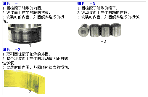 損傷狀態(tài):在安裝和拆卸時(shí)等使用時(shí)給滾道面及滾動面上造成的軸向線狀傷痕. 原 因:安裝、拆卸時(shí)的內(nèi)圈、外圈傾斜安裝、拆卸時(shí)的沖擊載荷。措 施:使用恰當(dāng)?shù)墓ぞ呤褂脹_壓機(jī)而防止了沖擊載荷。安裝時(shí)相互之間的定心。