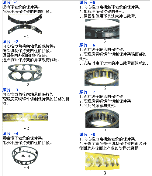 損傷狀態(tài):保持架的損傷有保持架的變形,折損,磨損等。柱的折損。端面部的變形。凹處面的磨損。導(dǎo)向面的磨損。原 因:安裝不良(軸承的非直線性)。使用不良。力矩載荷大。沖擊,振動(dòng)大。轉(zhuǎn)速過大,急加減速。潤滑不良。溫度上升。措 施:檢查安裝方法。檢查載荷,旋轉(zhuǎn)及溫度條件。降低振動(dòng)。糾正保持架的選擇。改變潤滑劑和潤滑方法。